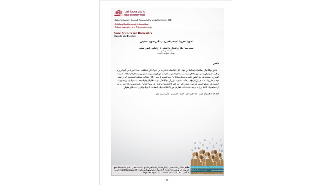 فاز فريق بحثي في مركز ابن خلدون للعوم الإنسانية والاجتماعية بجائزة أفضل ملصق بحثي في فئة هيئة أعضاء التدريس وما بعد الدكتوراه، ضمن المنتدى والمعرض البحثي السنوي لجامعة قطر 2021، وذلك عن بحث الصورة المعيارية للمجتمع القطري: دراسة في تصورات المقيمين، واستلمت الجائزة الدكتورة أسماء ملكاوي أستاذ باحث مساعد في علم الاجتماع في مركز ابن خلدون للعلوم الإنسانية والاجتماعية.
