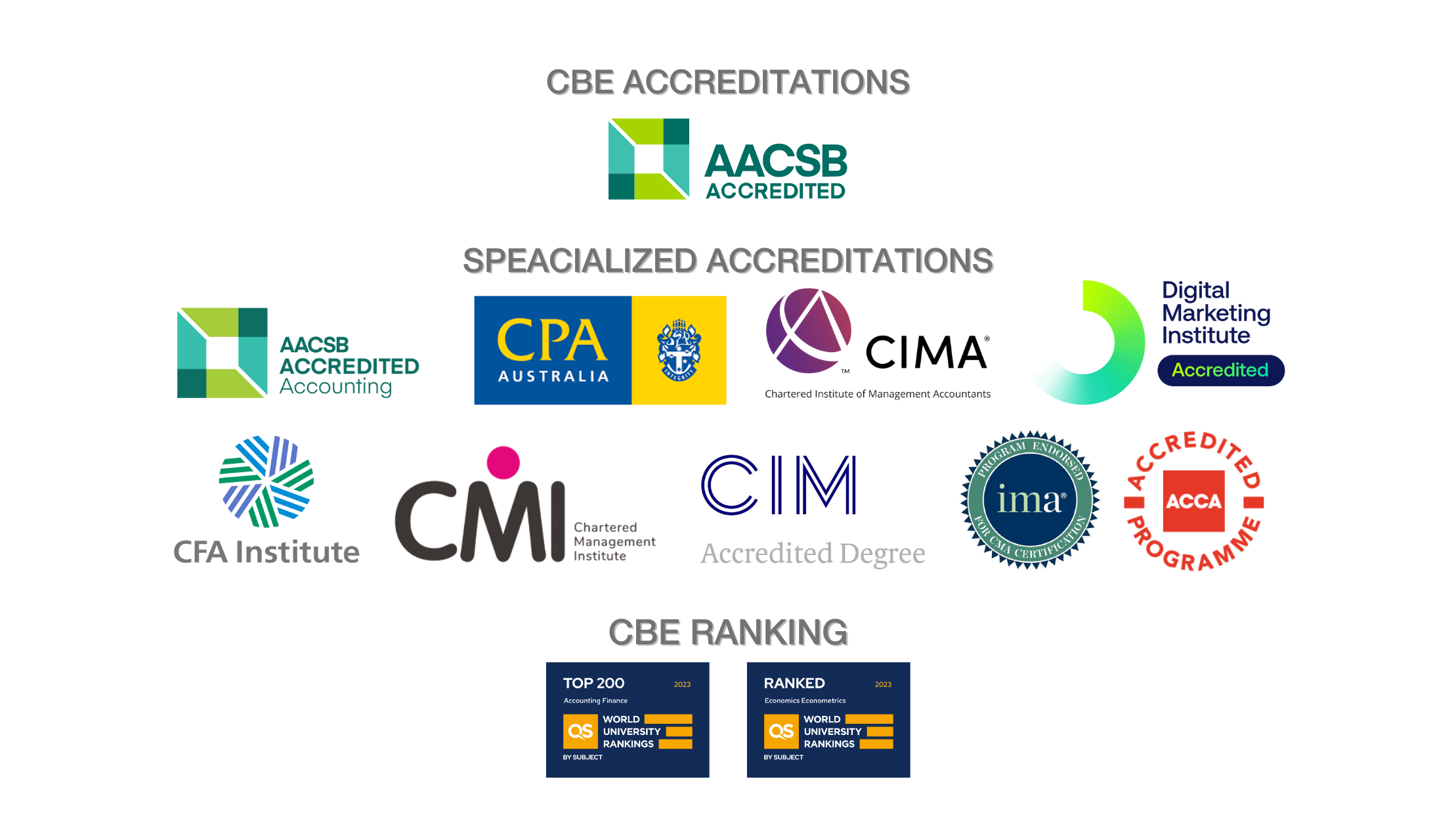 Institute of Internal Auditors (IIA) The Institute of Internal Auditors (IIA) is a globally recognized professional body dedicated to the advancement of the internal audit profession. The IIA's Internal Audit Awareness Program is designed to promote understanding and interest in internal auditing among students and emerging professionals. Engagement in this program reflects the academic institution's commitment to aligning with the core principles, standards, and competencies upheld by the IIA. It supports students in exploring career pathways in internal auditing, risk management, and governance, and enhances their readiness for future professional certifications such as the Certified Internal Auditor (CIA). Finance Accreditations CFA-affiliated University  The CFA Institute is the largest global association that provides finance education for investment professionals. Through its CFA University Affiliation Program (UAP), it recognizes academic institutions that broadly integrate at least 70% of the CFA Program Candidate Body of Knowledge (CBOK) into their curricula.