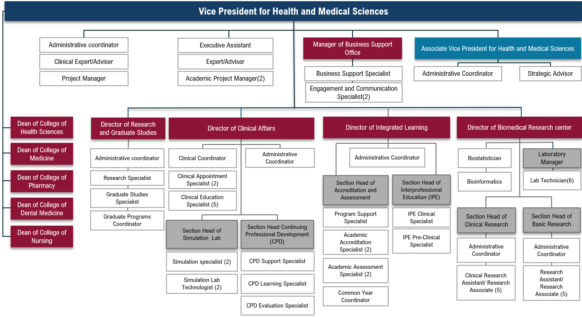 This organizational chart outlines the leadership and administrative structure under the Vice President for Health and Medical Sciences, detailing the reporting lines and functional units that support academic, research, and clinical activities. The Vice President is supported by a core team of coordinators, advisors, and project managers. At the top level, two key offices - the