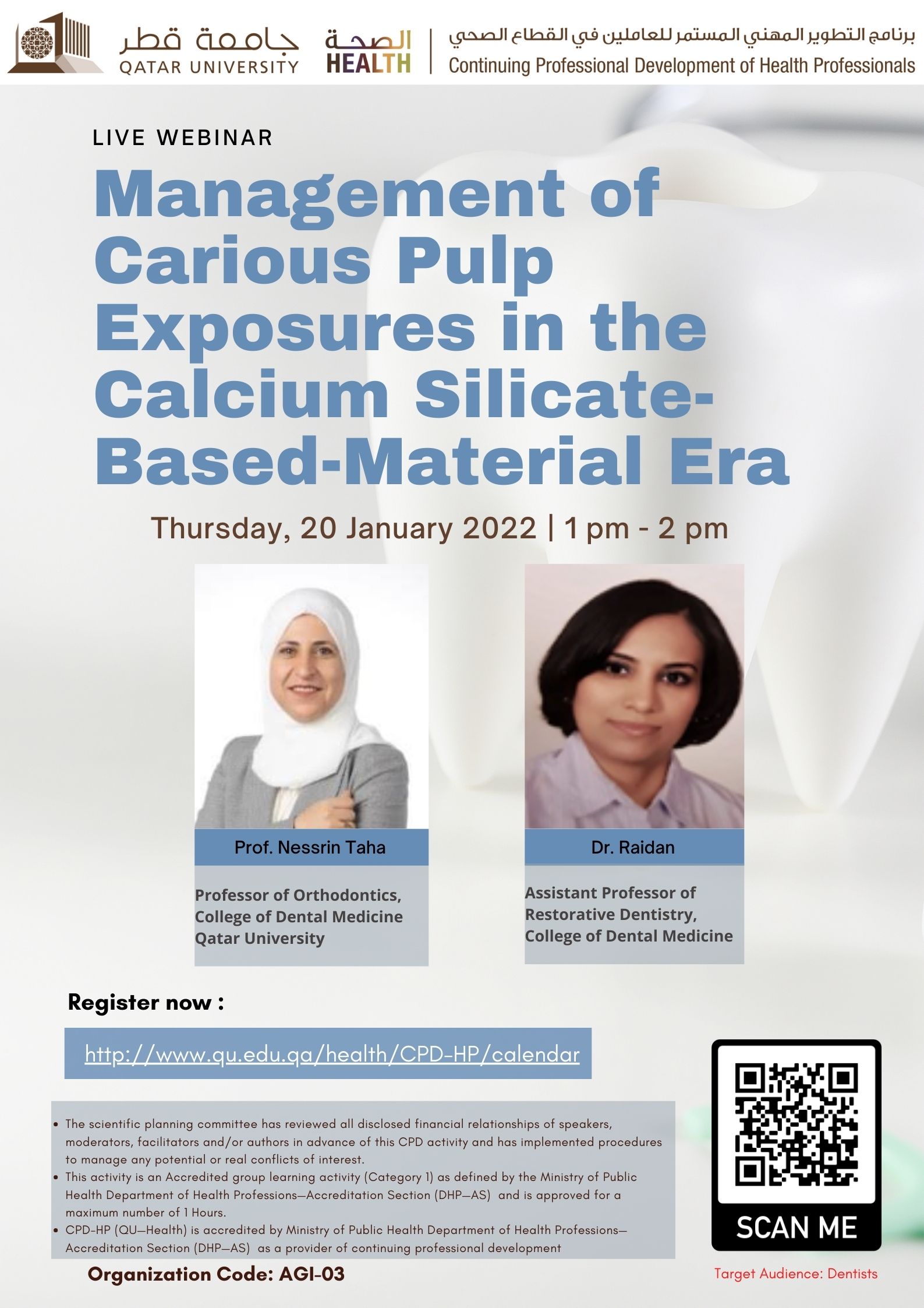 Management of Carious Pulp Exposures in the Calcium Silicate Based-Material EraThursday, Jan 20, 2022 1:00 pm | 1 hour | (UTC+03:00) Kuwait, RiyadhEvents No.: