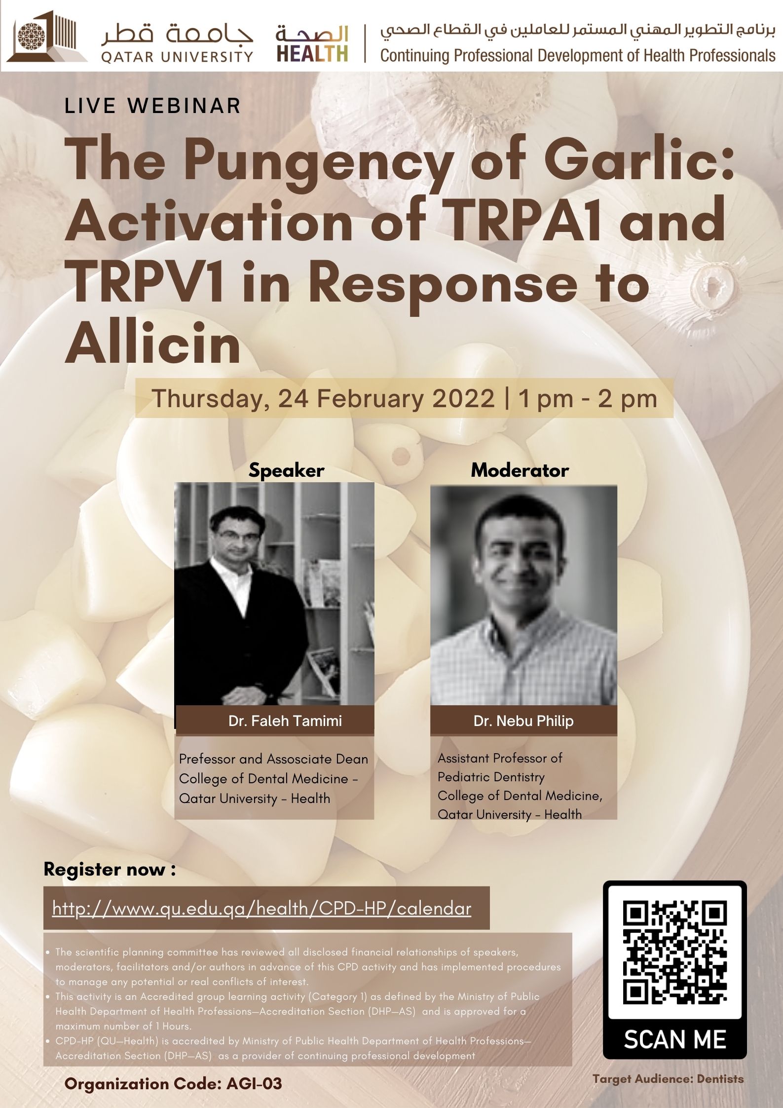The Pungency of Garlic: Activation of TRPA1 and TRPV1 in Response to AllicinThursday, Feb 24, 2022 1:00 pm | Doha TimeWebinar number: