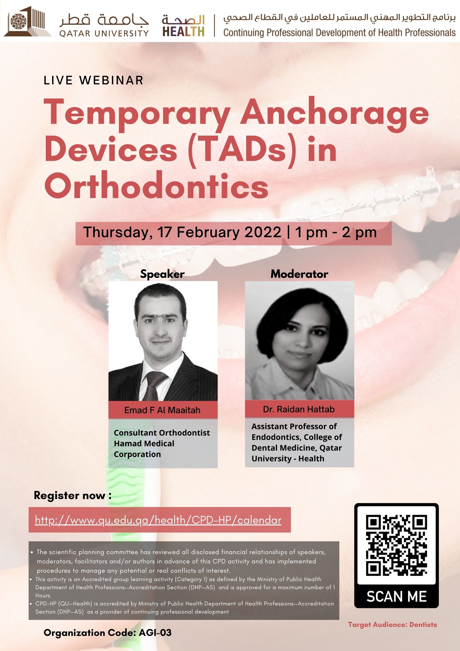 Temporary Anchorage Devices (TADs) in OrthodonticsThursday, Feb 17, 2022 1:00 pm | Doha TimeWebinar number: