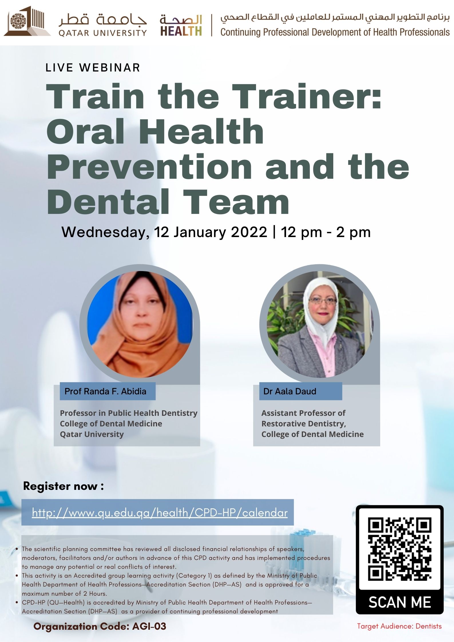 Train the Trainer: Oral Health prevention and the Dental TeamWednesday, Jan 12, 2022 12:00 pm | (UTC+03:00) Kuwait, RiyadhEvents No.:
