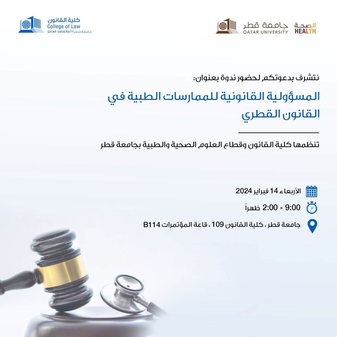 The International Conference on Complementary Medicine in Islamic Civilization: Elements of Integration and DevelopmentDate: 21 and 22 April 2025 Venue: College of Educations (Building I10), Qatar University The Legal Responsibility of Medical Practices in Qatari Law Conference In collaboration with the College of Law at Qatar University Date: 14 February 2024 Venue: College of Law (Building I09), Qatar University