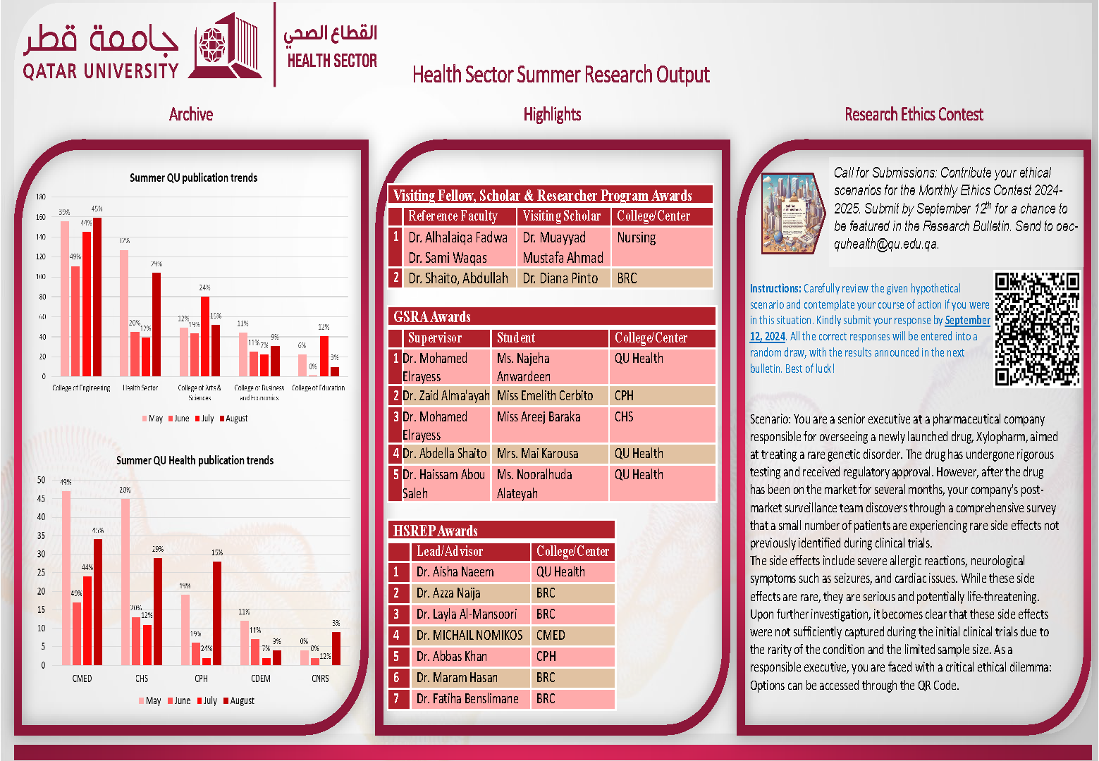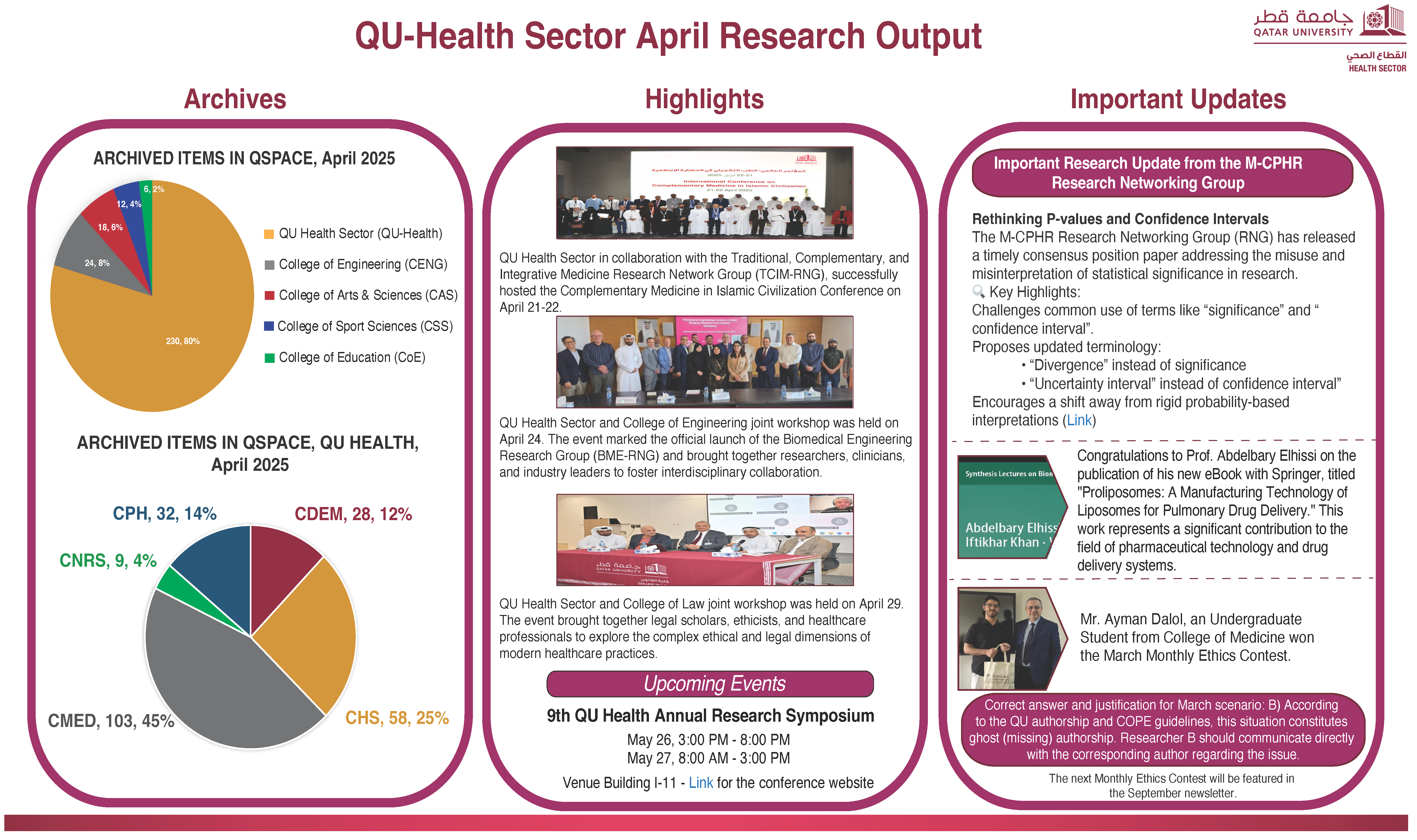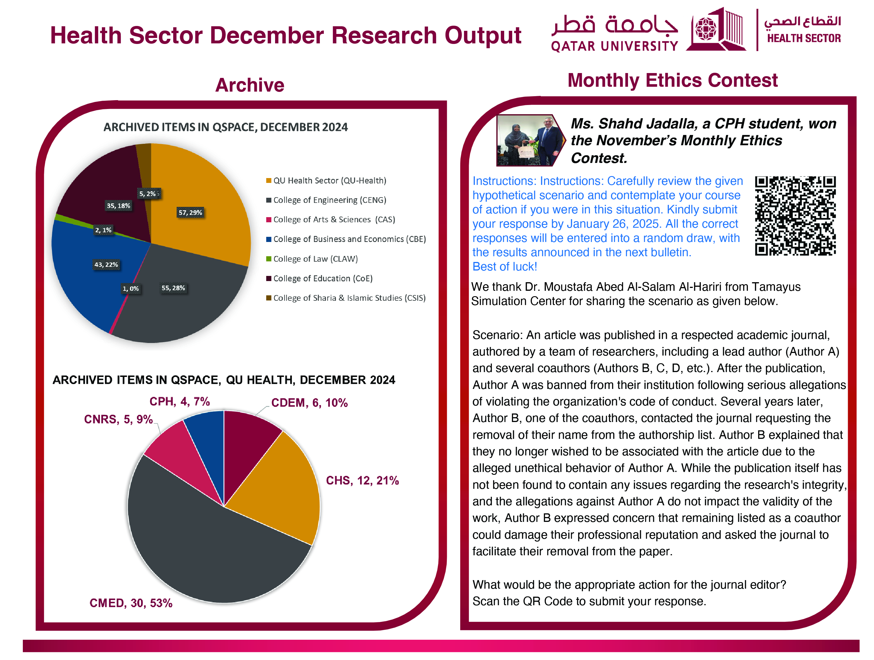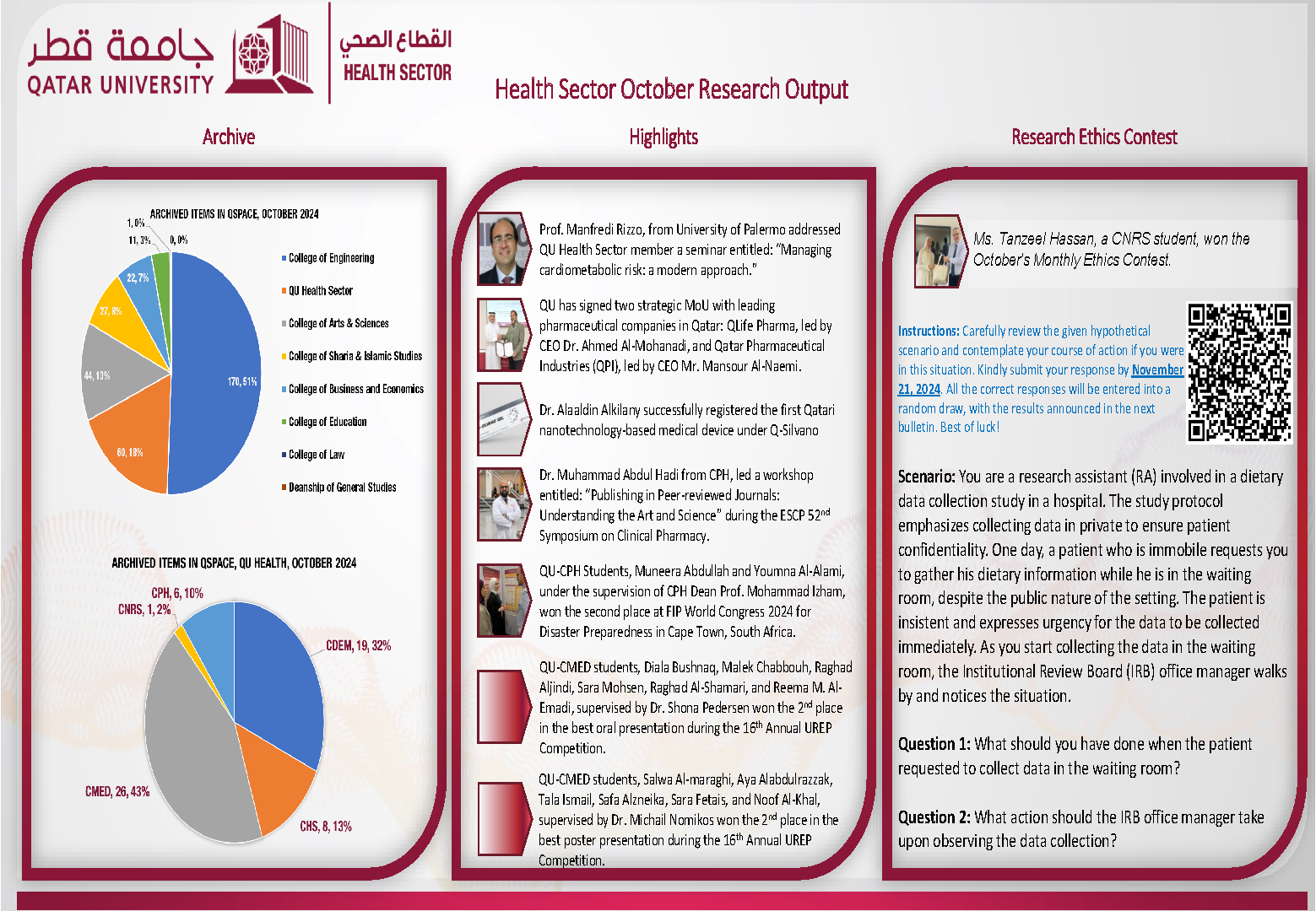 The QU Health Monthly Bulletin highlights success stories, key achievements, and notable activities from across our health colleges. Each edition aims to showcase the accomplishments of our colleagues and promote a culture of recognition and collaboration. We encourage research coordinators and faculty members to actively support and contribute by sharing relevant updates and highlights. Submissions are reviewed and featured in the upcoming issue to ensure a comprehensive reflection of our collective efforts.