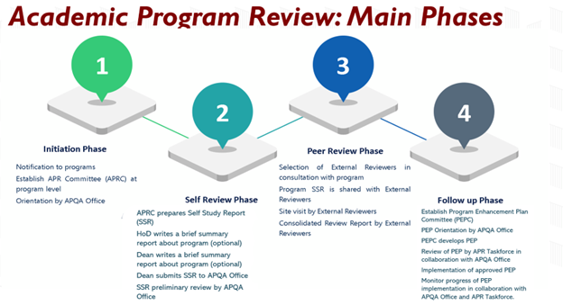The main purpose of Academic Program Review (APR) at Qatar University is to help evaluate the viability, productivity, and quality of academic programs offered at the university and to ensure that they are in line with the university's mission, goals, and strategic plan. The outcome of the program review is expected to provide sufficient evidence to warrant a decision to maintain and improve, restructure, deactivate or terminate a program.