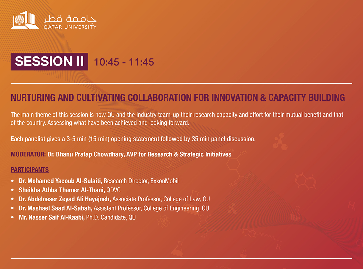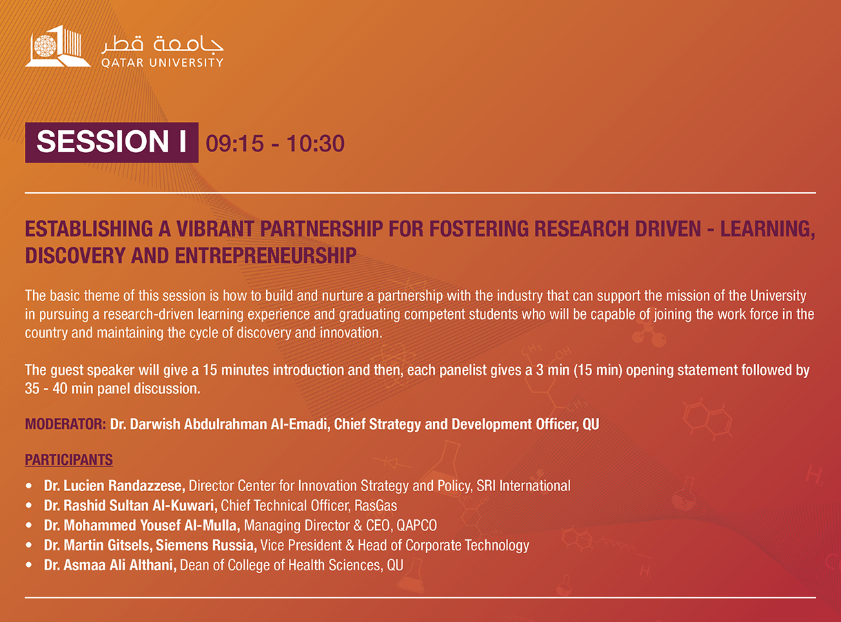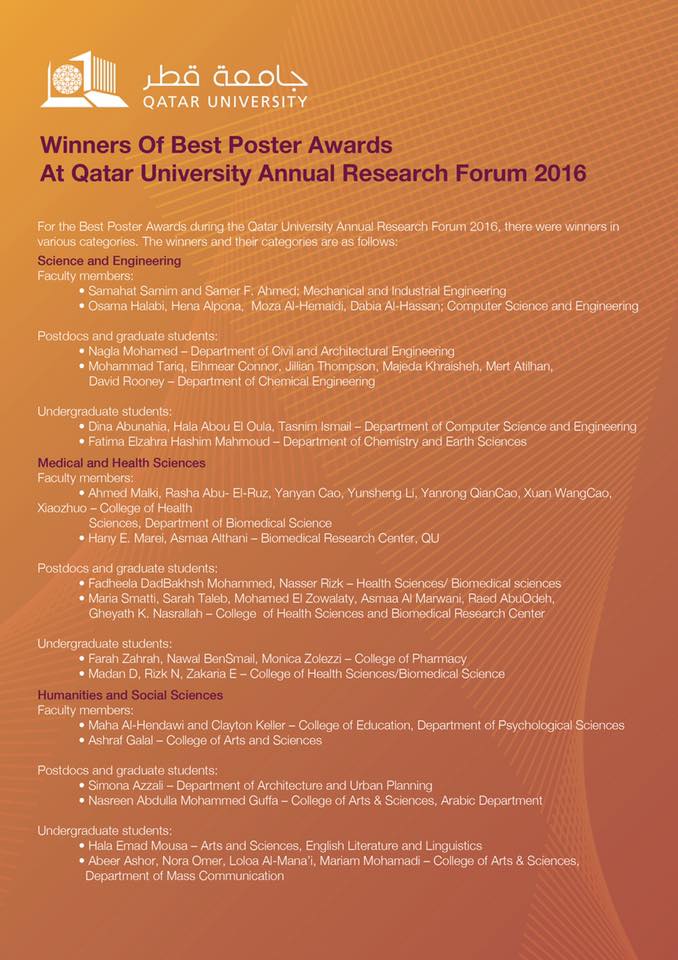 QUARF '16 is an occasion to present original research, demonstrate new tools, or report on the implementation of new programs, collaborations, innovations and other relevant projects that take bearing from the QU Research Roadmap, Qatar National Research Strategy and Qatar National Vision 2030.