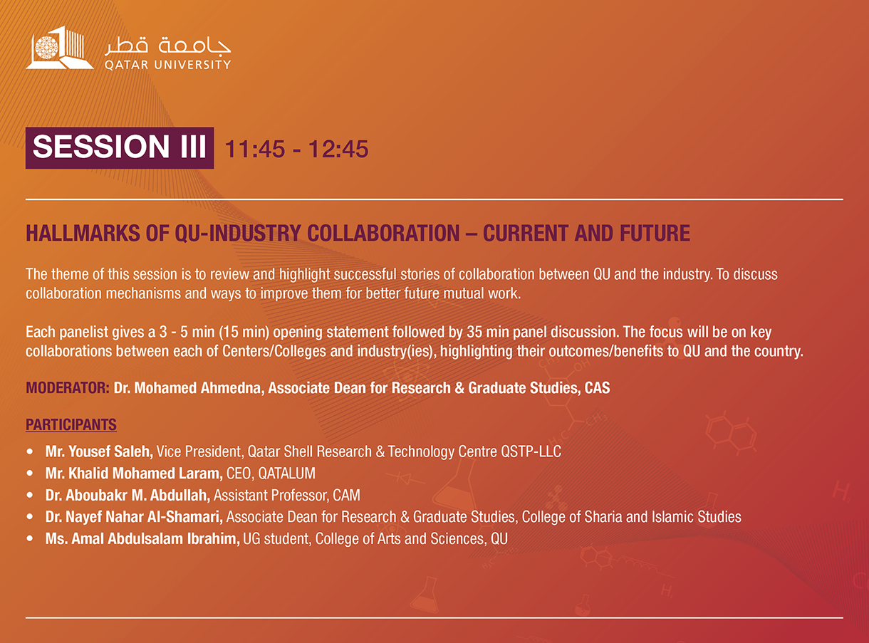 The Qatar University Annual Research Forum is a high profile event that targets members of the QU community – students, researchers, academics and partners. A one-day event featuring presentations, discussions and poster gallery, it represents a unique opportunity for participants to showcase their research through posters, interactive presentations, exhibits, and personal discussions with their colleagues and other scholars.