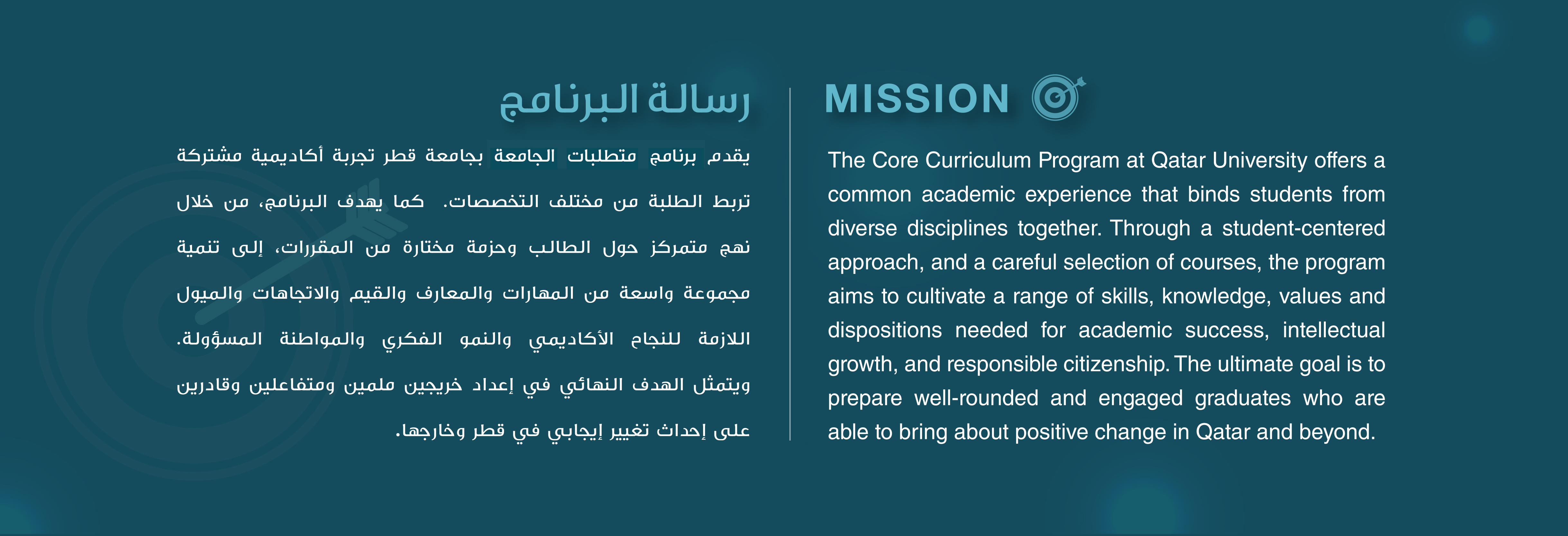 The Core Curriculum Program at Qatar University aspires to become a model for general education that fosters academic success, intellectual growth, and responsible citizenship.