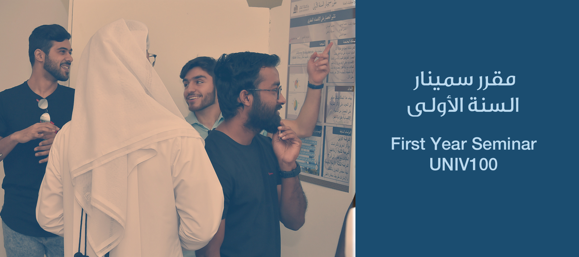Students work in teams on a research project to tackle a current civic issue in Qatar. Their journey starts by brainstorming on possible research problems and ends by disseminating their findings through presentations, posters, and sometimes academic publications. The project increases students’ awareness of challenges faced in the community and their role as engaged citizens to prepare them for responsible citizenship.