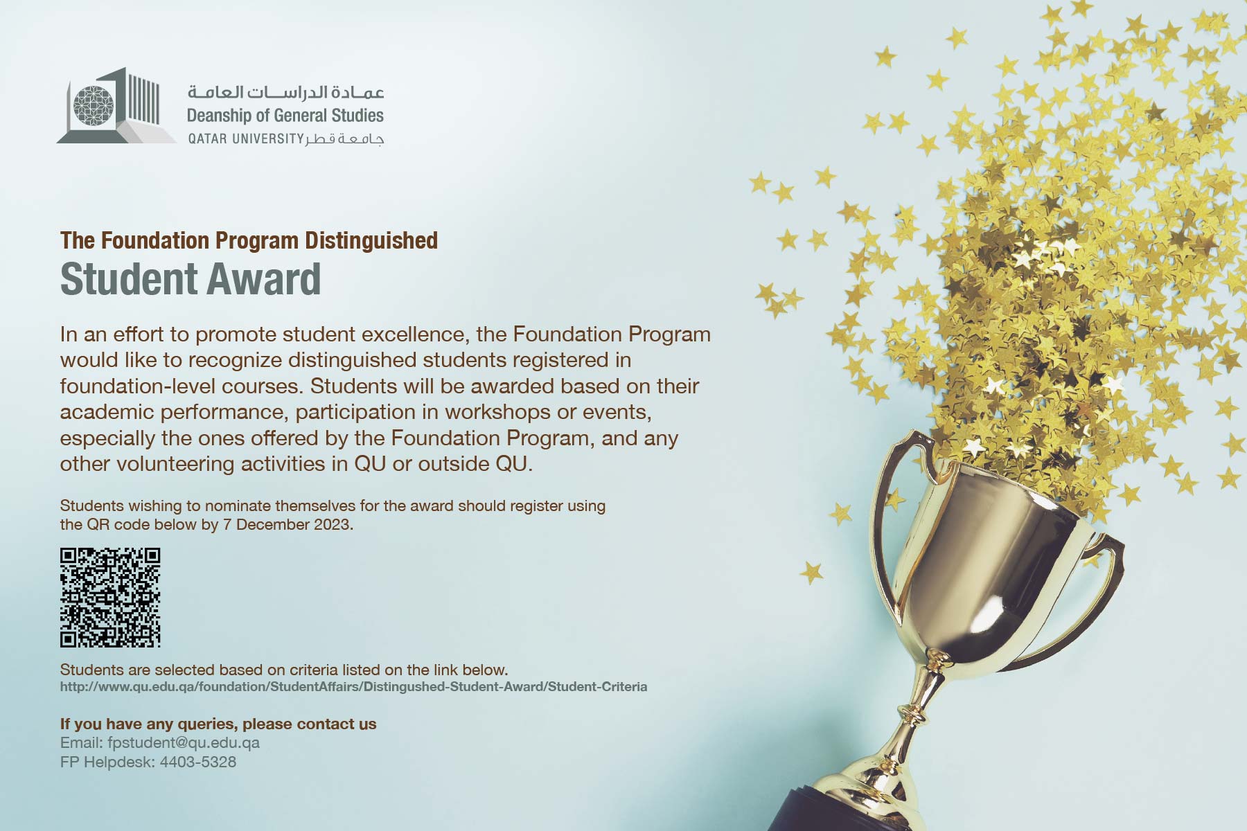 Students wishing to nominate themselves for the award, can also register via this link. For the list of criteria, click here. If you have any queries please contact us via email or telephone: fpstudent@qu.edu.qaFP Helpdesk: (+974) 4403-5328