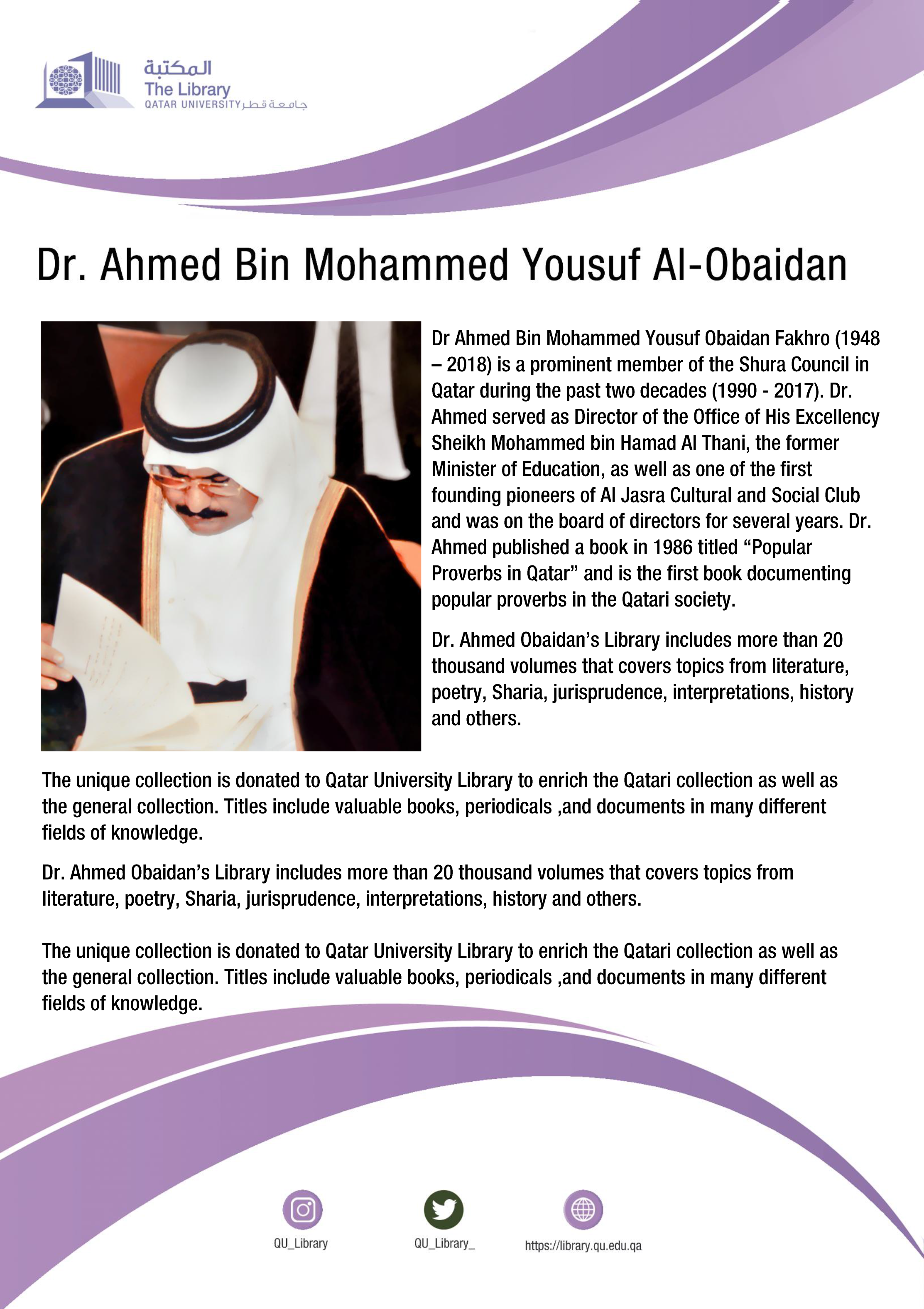 Dr. Ahmed Obaidan’s Library includes more than 20 thousand volumes that covers topics from literature, poetry, Sharia, jurisprudence, interpretations, history and others. The unique collection is donated to Qatar University Library to enrich the Qatari collection as well as the general collection. Titles include valuable books, periodicals ,and documents in many different fields of knowledge.